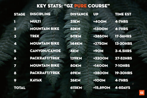 The above table outlines the basic statistics for the GZ PURE Course for Chapter 12. There are two time cut offs on the course that will ‘capture’ those teams who had no prospect of completing the Full Course in the time allowed. Both time cut offs take place at TA6 which is located at the end of the Stage 6 Packraft/Trek. Teams must depart TA6 (start Stage 7) before 1am Wednesday or they are moved on to Short Course 1. Short Course 1 teams miss TA7 and do a shorter Stage 7 and Stage 8, before kayaking to the finish. Teams who depart TA6 after 1am Thursday are moved on to Short Course 2. Short Course 2 teams do a shorter Stage 7 and miss Stage 8 entirely, before kayaking to the finish. All teams must arrive at the finish before 5pm Friday when the course closes (otherwise they become Unranked).