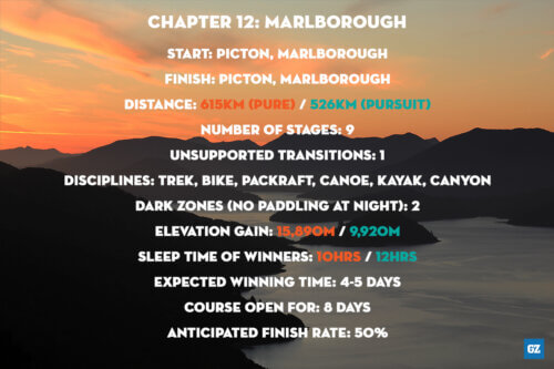 Teams start Chapter 12 One NZ GODZONE at Picton Foreshore, gateway to the Marlborough Sounds and will finish nearby at Shelly Beach after completing a vast clockwise loop. The PURE course is a substantial 615km (the third highest ever) with teams navigating, packrafting, trekking, mountain biking, kayaking and even canyoning across the spectacular scenery of the South Island. The course has almost 16,000m of ascent which is the most ever for a GODZONE. The PURSUIT course broadly mirrors the PURE route. There are some small amendments to stages and checkpoint locations which, reduces the overall length of the PURSUIT course to a still impressive 526km.